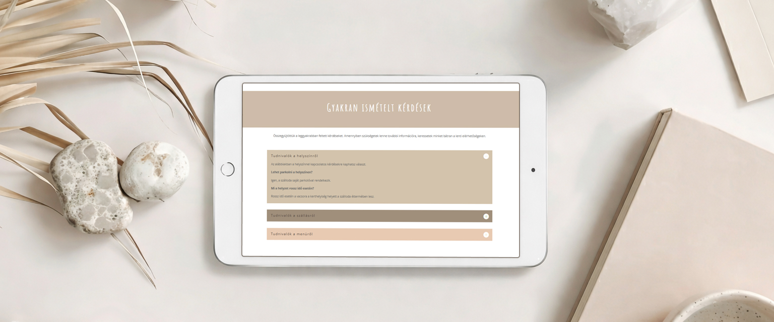 Az esküvői weboldalon elhelyezett GYIK mindig kéznél van. Telefonról, tabletről, bárhonnan elérhető – ha valaki bizonytalan, egyszerűen visszanézi.