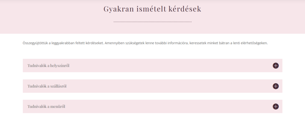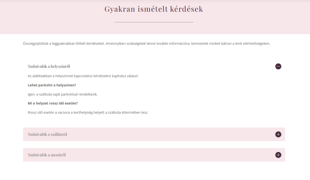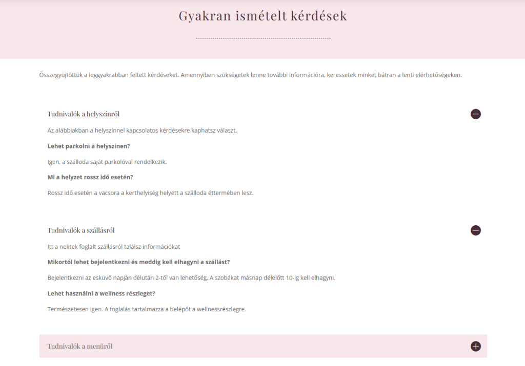 A Wedding Sytesbook esküvői weboldalain a GYIK szekció kifejezetten arra lett kialakítva, hogy a leggyakoribb kérdések gyorsan átláthatók és könnyen frissíthetők legyenek.